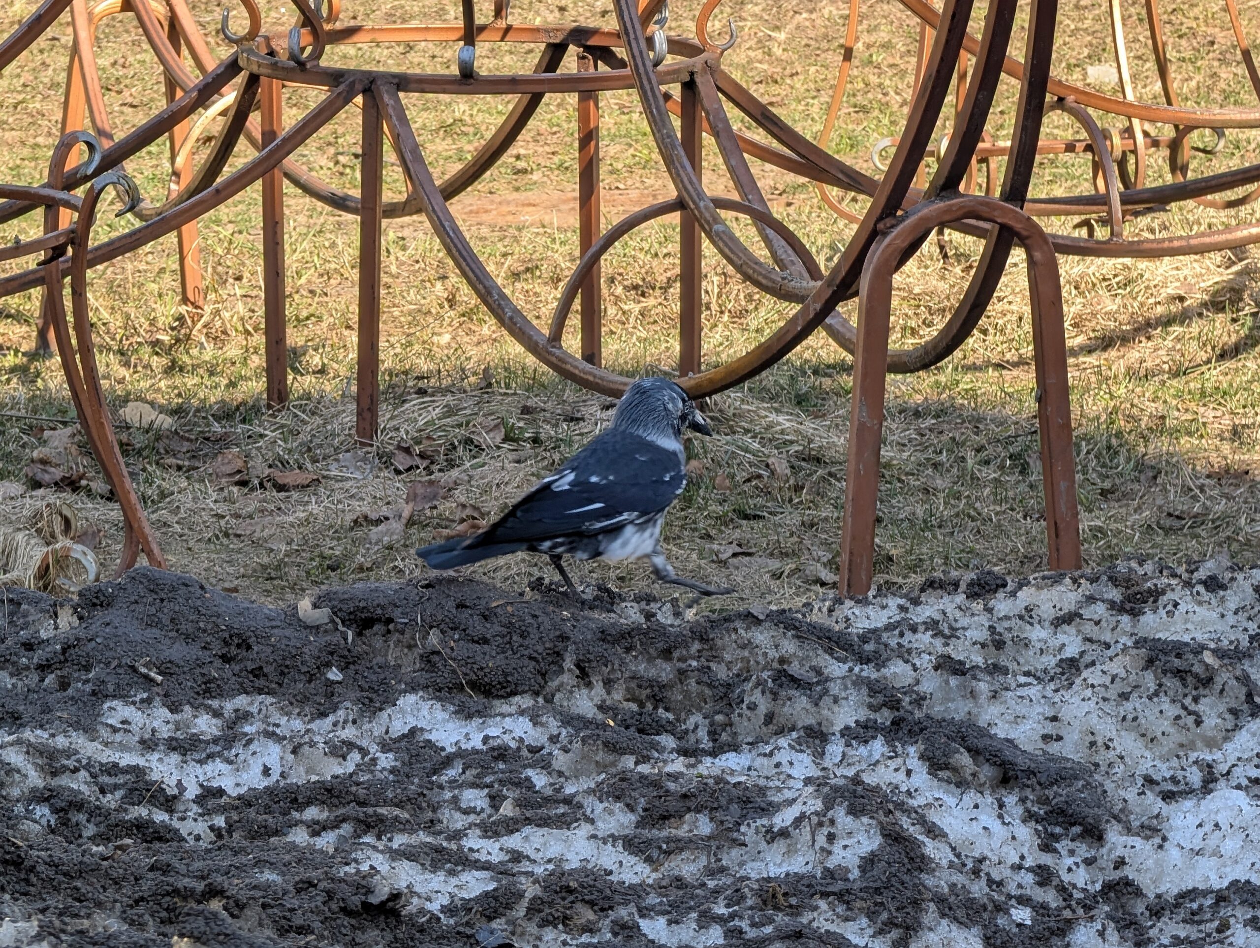 Обитает такая галка в посёлке Лесной, что на северо-восток от Москвы по Ярославскому шоссе — именно туда ведёт тоннель, про который я упомянул в самом конце моего недавнего рассказа про Зеленоградский. Тоннель в другой мир… Но эту тему, пожалуй, оставлю на потом. А сейчас ещё отмечу, что птица неплохо маскируется на фоне кучи снега, перемешанного с грязью — чёрно-белое на чёрно-белом =) Но в любой другой обстановке, наоборот, резко выделяется среди прочих.