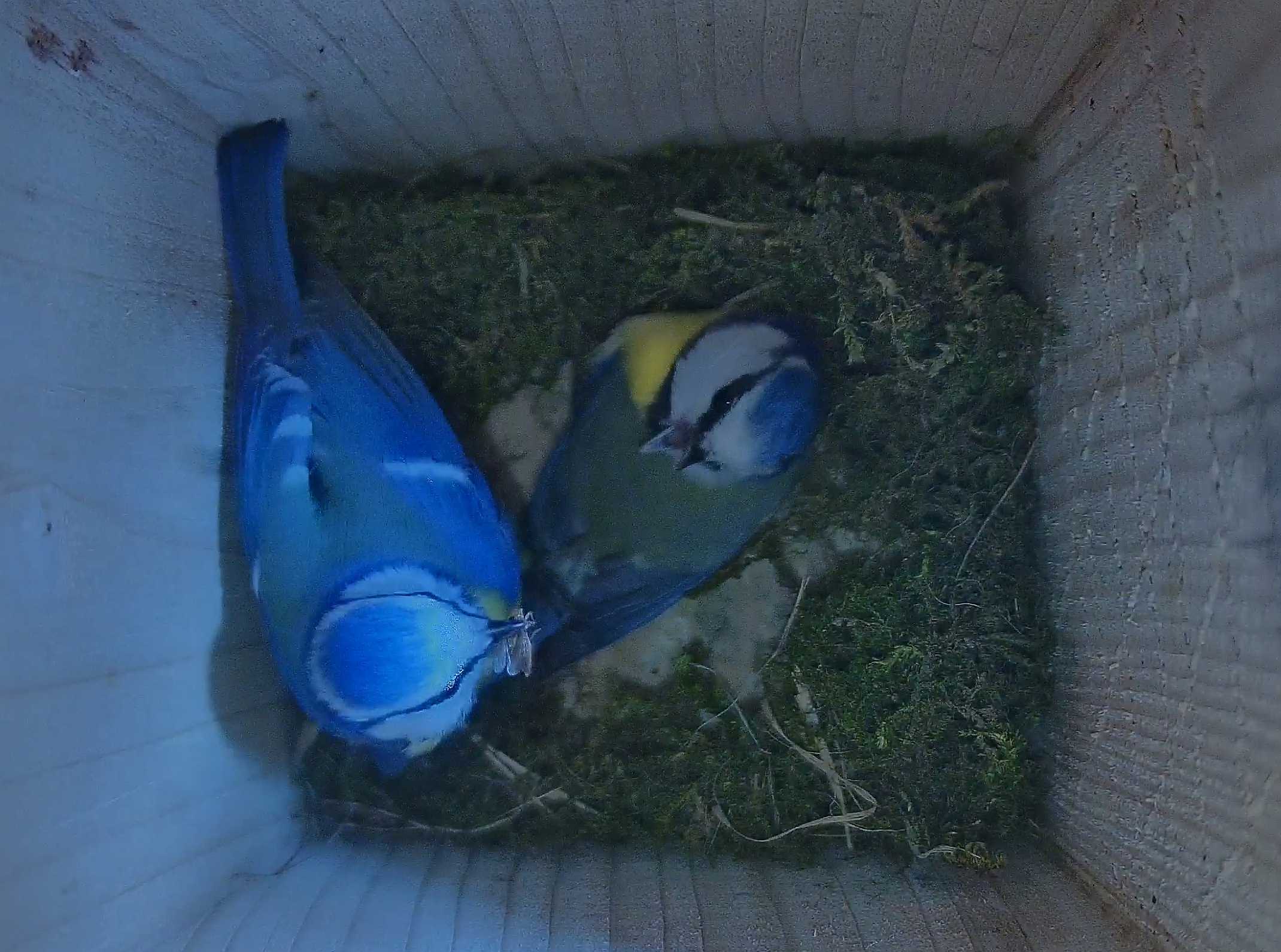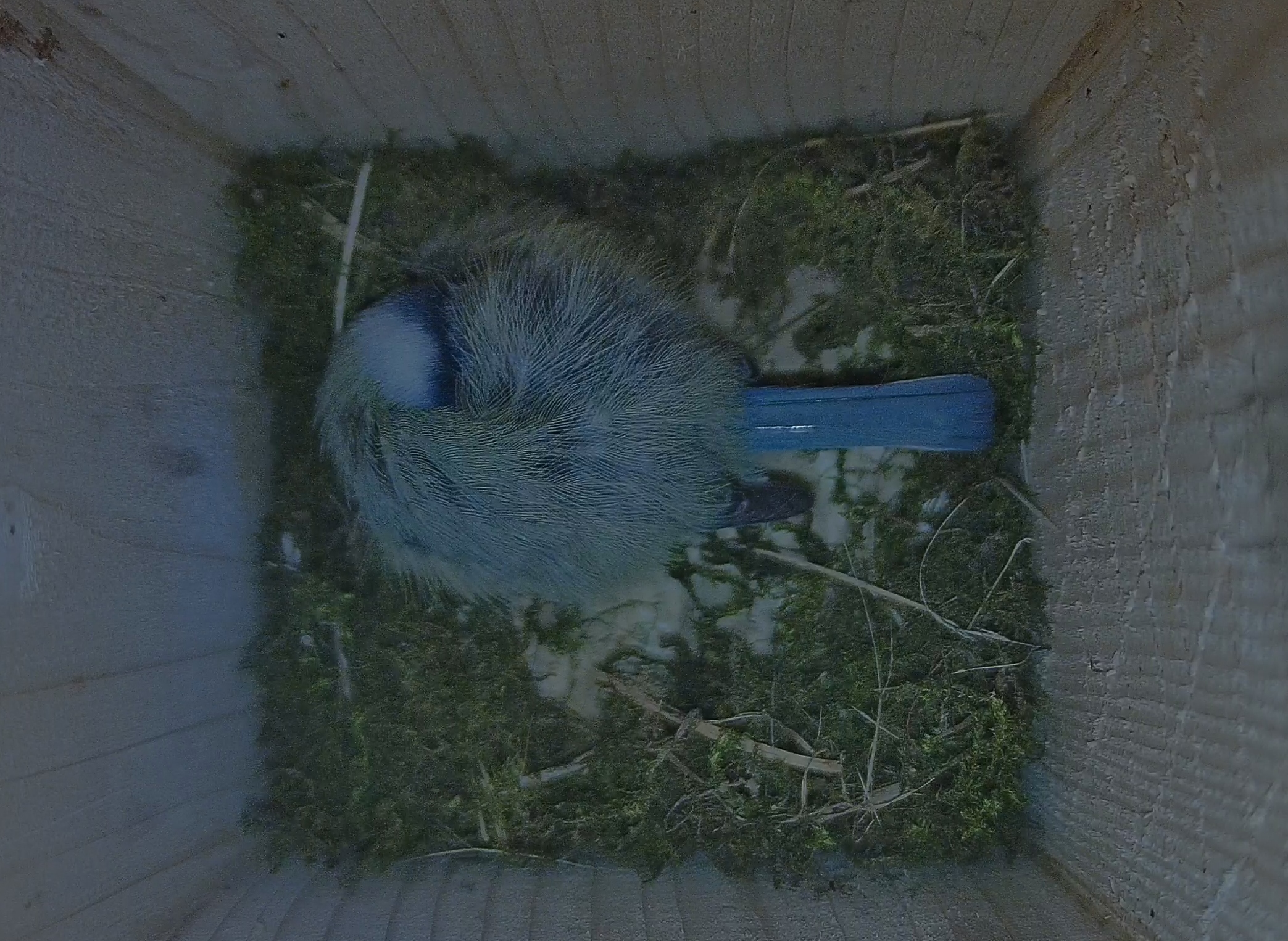 Начиная с первого апреля, самка также стала ночевать в домике вместо самца, который прекратил делать это ещё 9 марта. Теперь она, скорее всего, будет оставаться на ночь каждый день до тех пор, пока птенцы не подрастут и не заполнят собой всё окружающее пространство. Само собой, всё с той же оговоркой — если они вообще появятся. Иногда камера переходит в ночной режим уже после того, как птичка засыпает, но, судя по всему, никакого внимания на дневную подсветку она не обращает.