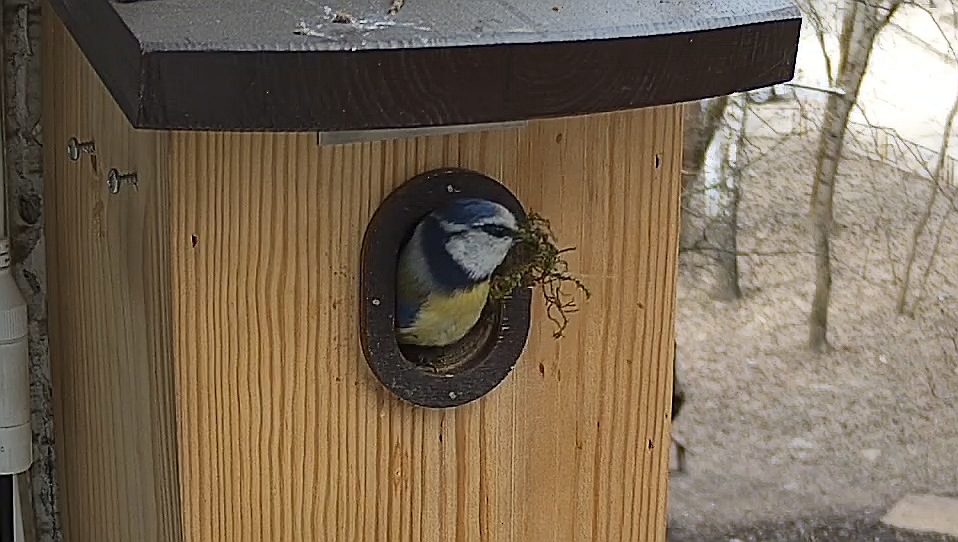 Кстати, и самка ничем в этом плане не лучше — я несколько раз смог «застукать» её за выносом из домика мха, который она сама же туда и натаскала. Однако спустя какое-то время она перестала этим заниматься. Есть предположение, что птичка могла обнаружить в принесённых ей стройматериалах каких-то вредных насекомых, совсем недавно вышедших из спячки и поэтому не замеченных ранее в процессе отбора. Но это не точно.