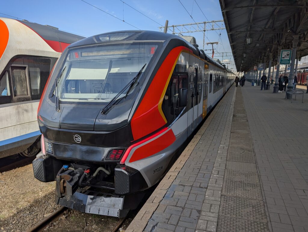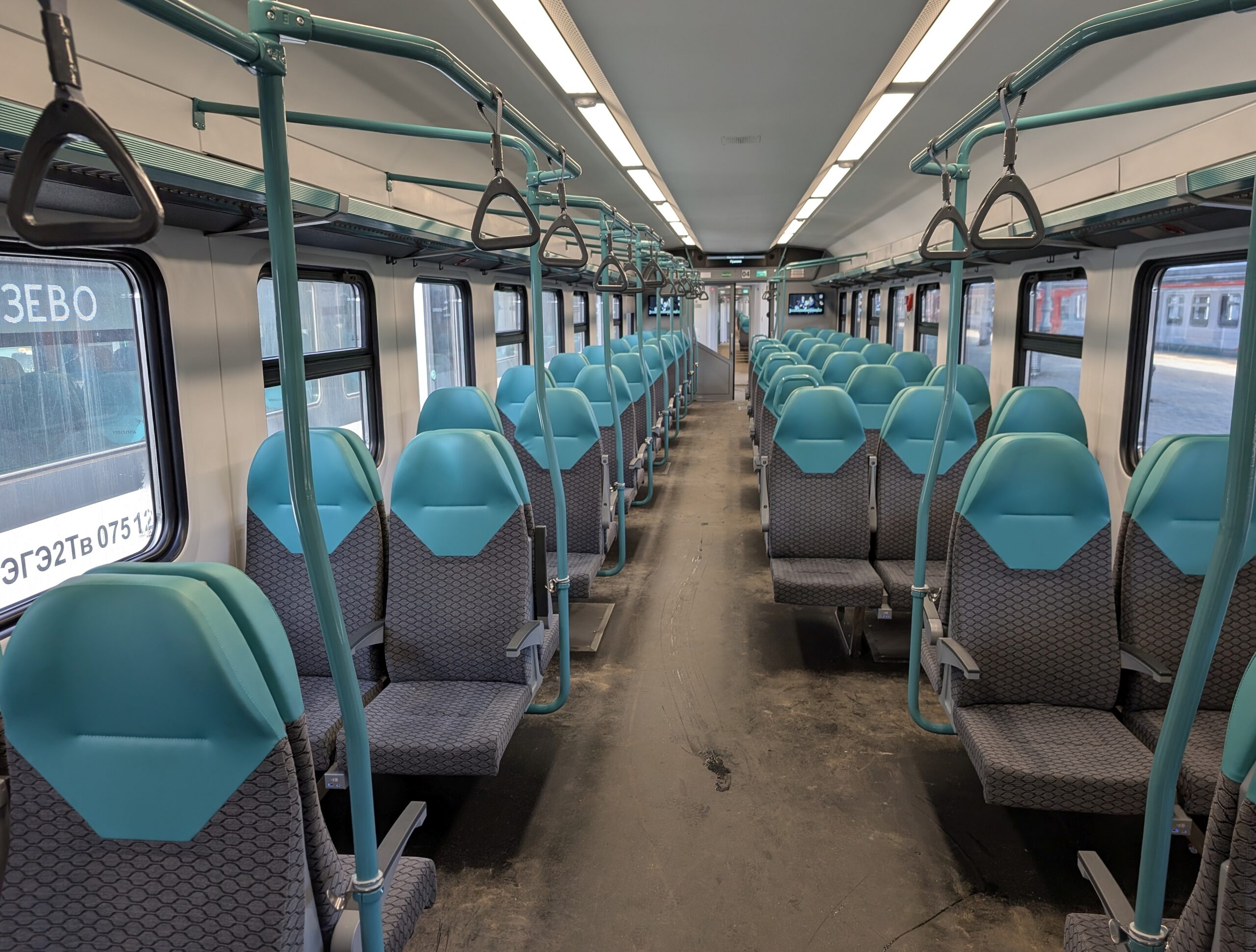 Сиденья, кстати, сильно напоминают таковые в «Иволге». Компоновка салона в основной его части выполнена по схеме 2+3, что немного уменьшает количество сидячих мест, но увеличивает число стоячих — в итоге получается нечто среднее между чисто «городской» и «пригородной» конфигурацией. Время покажет, насколько успешно зарекомендует себя такое решение, но, как мне кажется, пускать эти электрички на самые дальние маршруты, например, в Александров, определённо не стоит — пассажиры не обрадуются, если из-за нехватки кресел им придётся стоять всю дорогу.