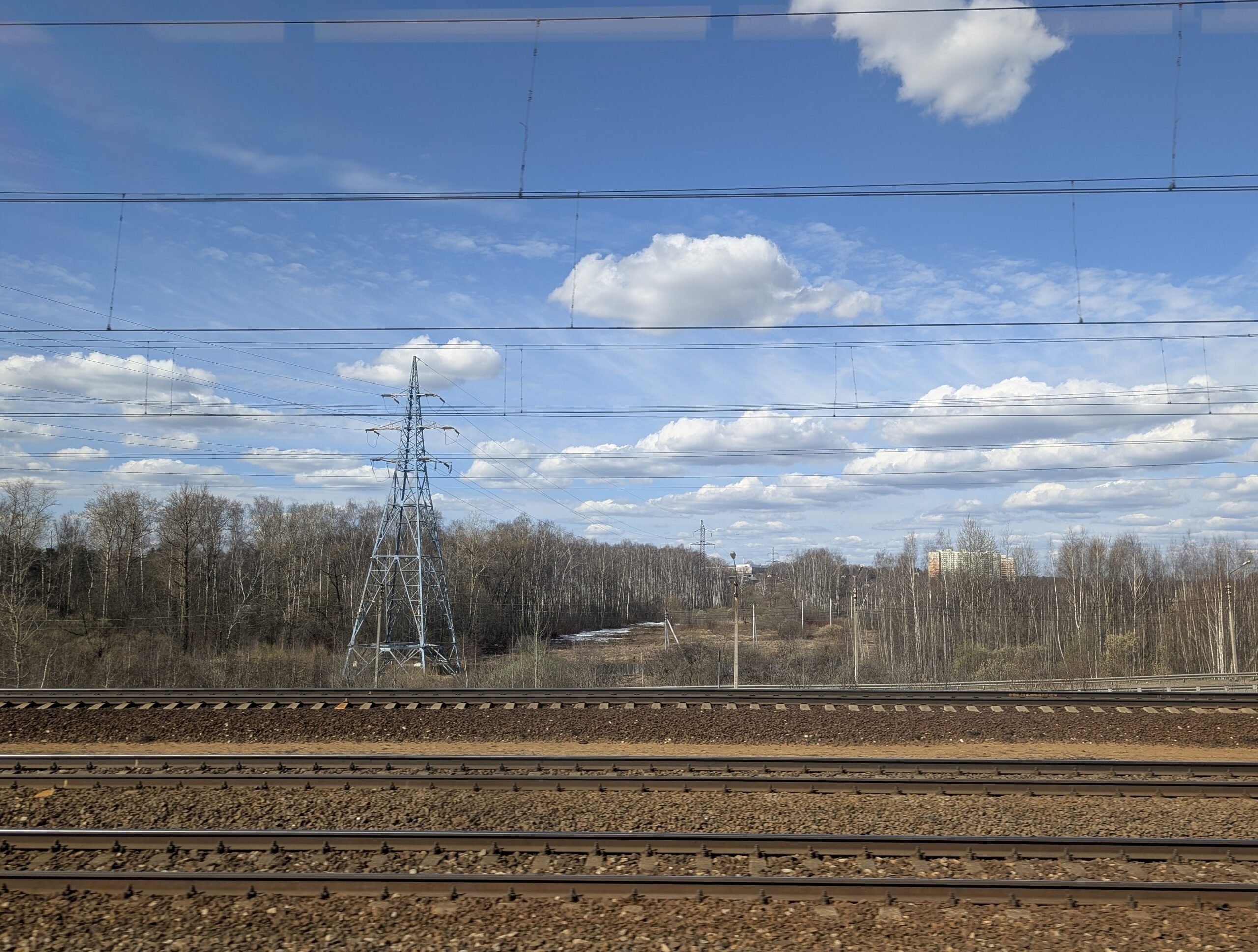 Однако мне стоять точно не придётся, ведь на календаре суббота, а поезд следует всего лишь до Пушкино, где с транспортной доступностью особых проблем нет, так что какого-то особо повышенного спроса ожидать не стоит. За окном — типичная ранняя весна: деревья всё ещё голые, но почти весь снег уже сошёл. Редкая облачность в целом не препятствует солнцу прогревать почву. Если ситуация радикально не изменится в худшую сторону, то всего через каких-то пару-тройку недель тут всё будет зелёное…