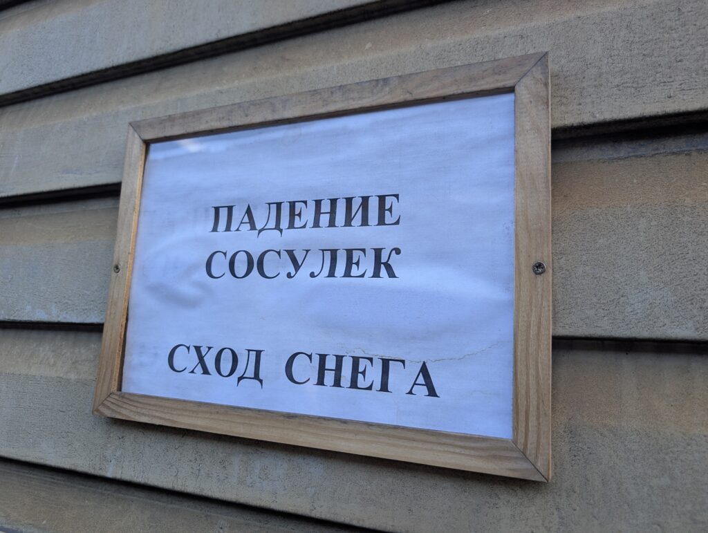 Впрочем, на платформе пока что не спешат убирать предупреждающие таблички, информирующие пассажиров о возможности внезапного падения на них как собственно снега, так и чего-то более твёрдого и опасного вроде сосулек. А может, эти таблички здесь висят круглый год? Ведь никто не может гарантировать, что даже в середине июля внезапно не пойдёт снег: вероятность такого события хоть и крайне мала, но никогда не равна нулю.