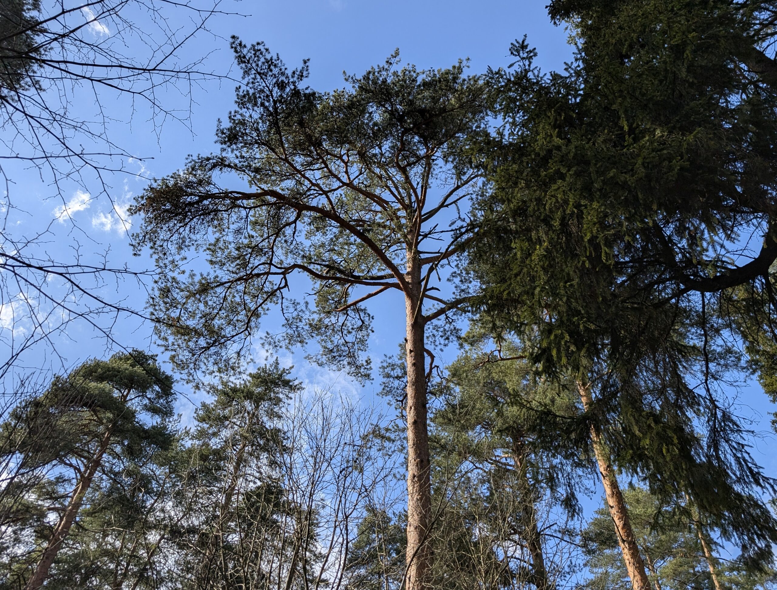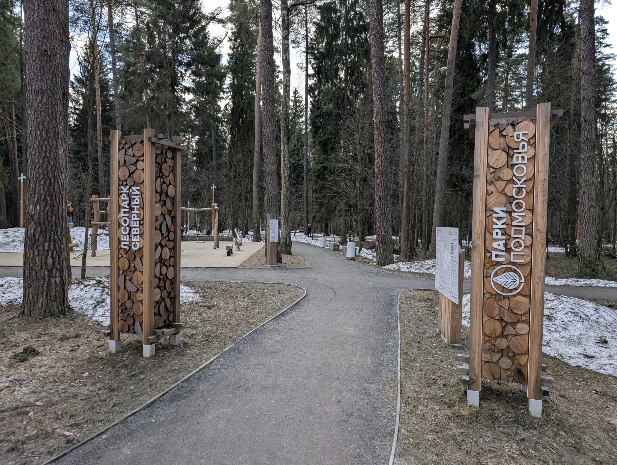 Радует также, что лесопарк состоит в основном из хвойных деревьев, наличие на которых зелени практически не зависит от времени года. Ели и сосны здесь представлены примерно в равных пропорциях, но именно на соснах я всегда акцентирую внимание в первую очередь. Пушкино, как и многие другие населённые пункты восточного и северо-восточного Подмосковья, в этом плане не подводит.