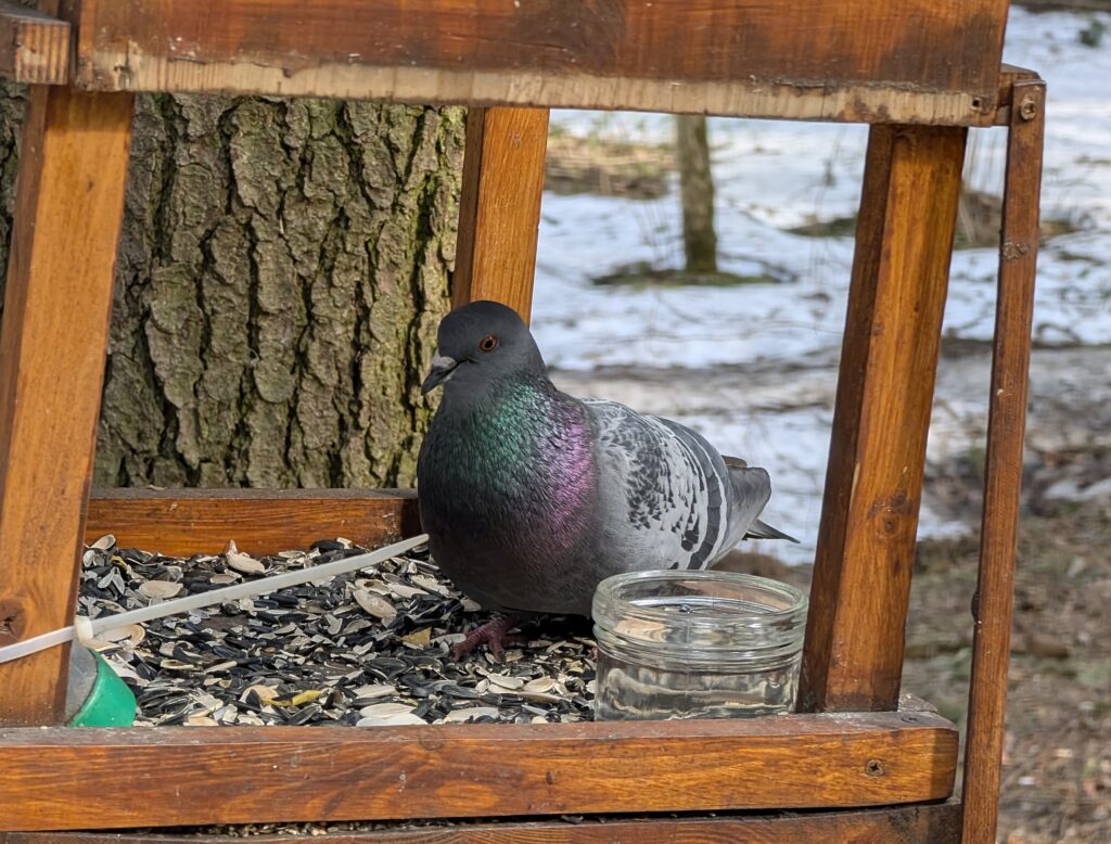 Не гнушаются посещать парк и голуби, обитающие в немногочисленных прилегающих к нему дворах. Ну а как тут не прилететь, если в кормушке столько семечек и не нужно даже выполнять никаких акробатических трюков, чтобы до них добраться? Поскольку голубей мало, корма должно хватить всем, в том числе и мелким птицам. Кто-то даже поставил им баночку с водой, хотя смысл в ней обычно есть лишь в жаркую погоду — в остальное время вполне достаточно воды в лужах. И всё равно, что она грязная…