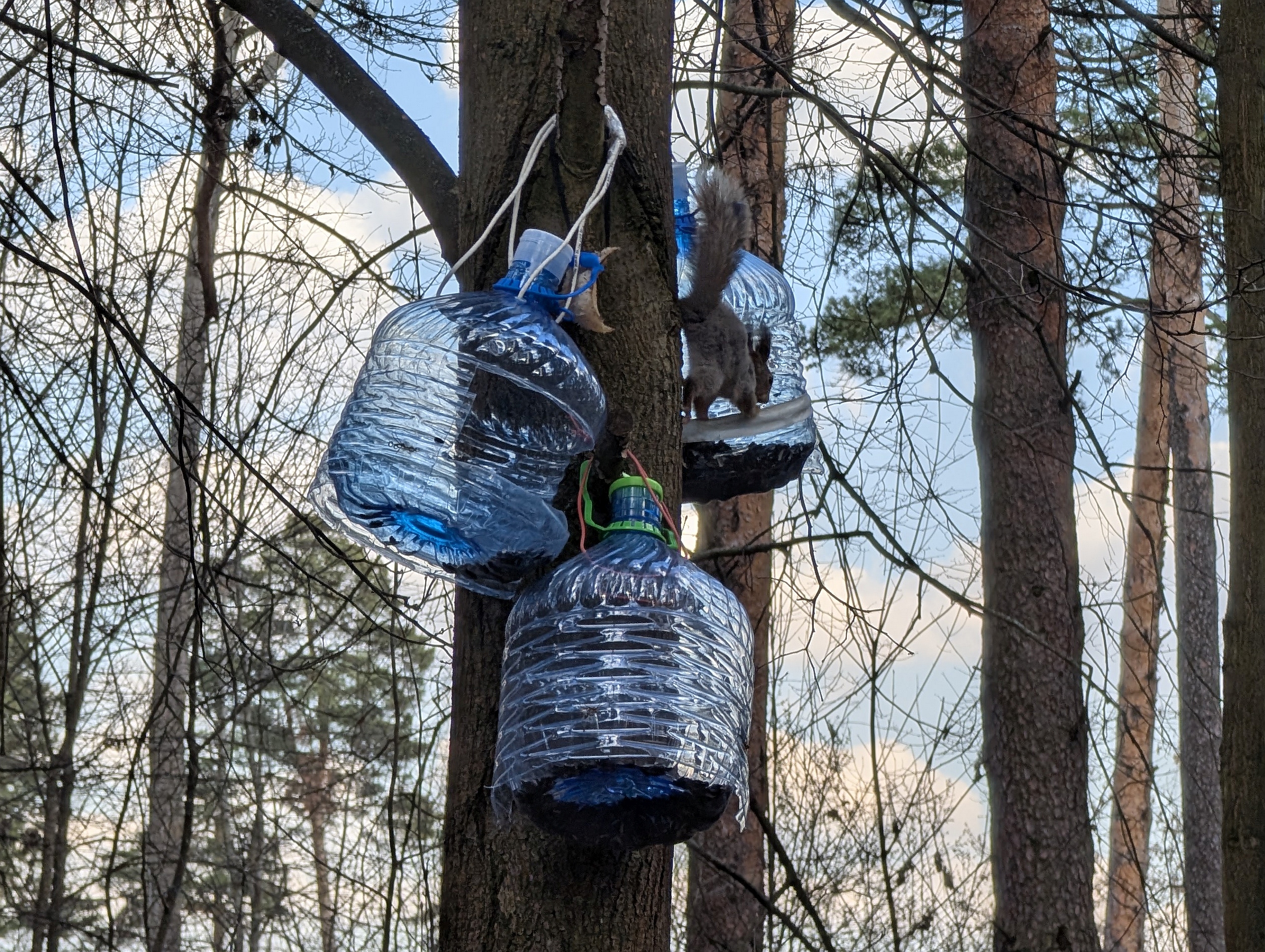 Для белок, которые здесь, конечно же, водятся, развешаны отдельные кормушки. С учётом того, на какой высоте закреплены многие из них, невольно приходит в голову мысль, что работы по установке этих кормушек проводились в первую очередь силами самих белок. Ну или просто кто-то воспользовался приставной лестницей, но это ведь было бы уже далеко не так интересно, правда? Так или иначе, белки кормушками активно пользуются.