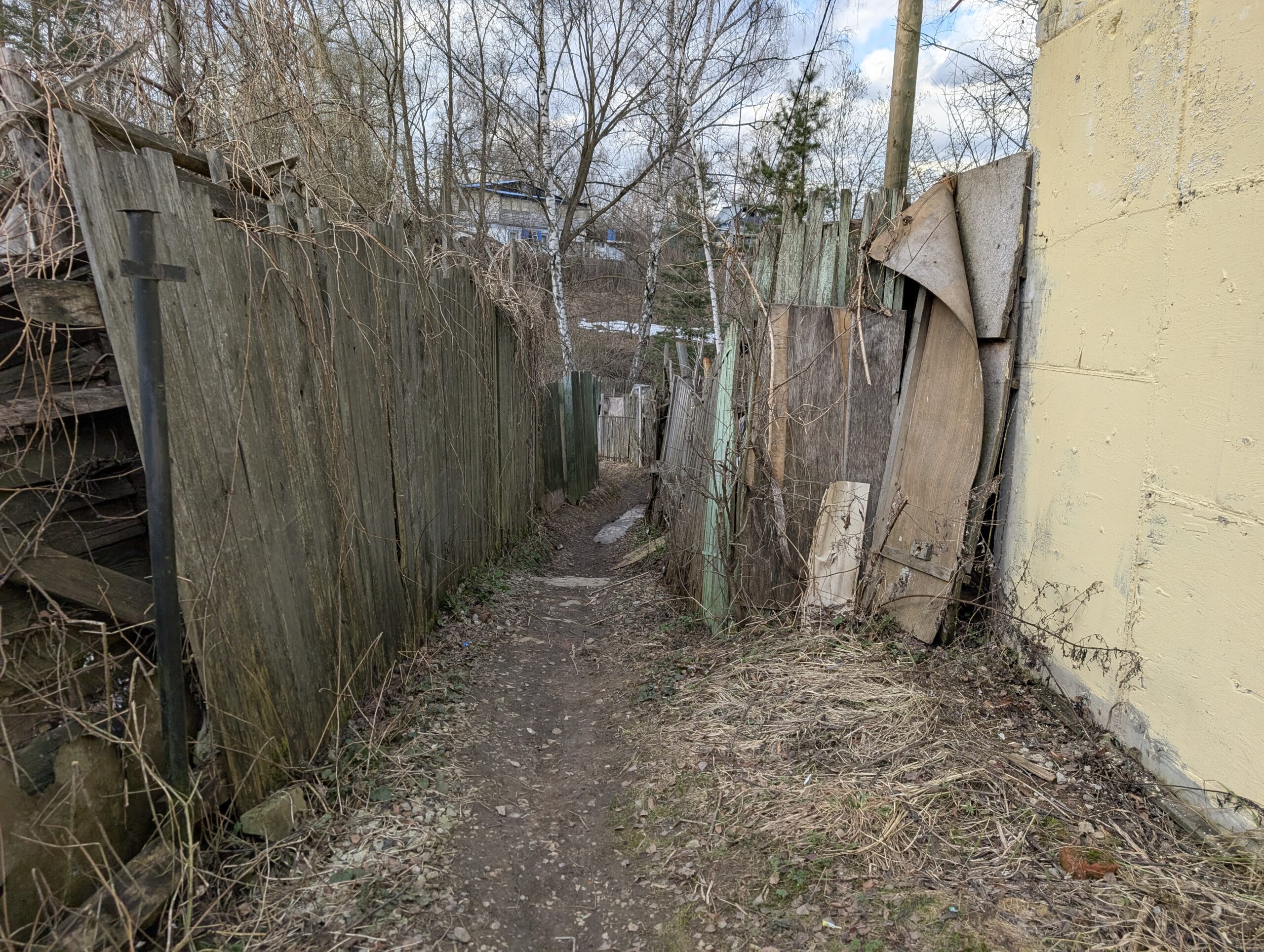 Наиболее прямой путь к музею проходит по узкой тропинке, зажатой между двумя заборами. Из-за того, что тропинка почти весь день находится в тени, местами на ней до сих пор лежит снег, а то, что уже успело растаять, в срочном порядке превращается в грязь. В такие моменты начинаешь ощущать, будто и правда вернулся в XX век — кажется, наше путешествие во времени пошло немножечко не по плану… Заканчивается тропинка перед мостиком через небольшую мелкую речку, чьё название не отмечено ни на одной карте.
