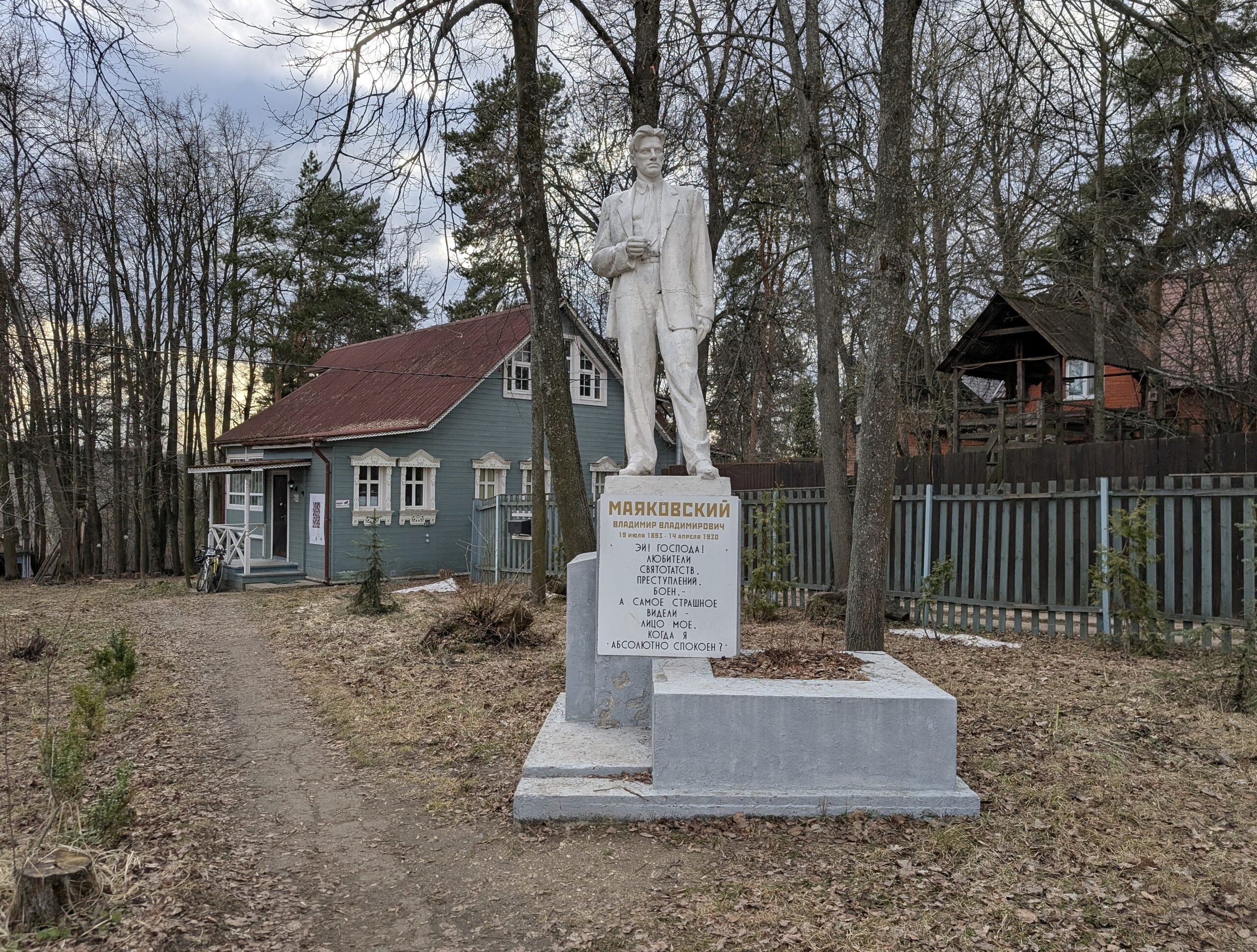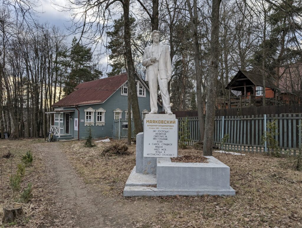 Но если задуматься ещё глубже, то возникает вопрос — а при чём тут вообще Маяковский и какое отношение он имеет к городу Пушкино? И ответ будет следующим: отношение имеет самое непосредственное, поскольку он снимал где-то в этих местах летнюю дачу в далёкие 1920-е годы. Дача сохранилась и в наши дни работает как музей, гостей которого и поныне встречает у входа великий поэт — точнее, его каменное изваяние.