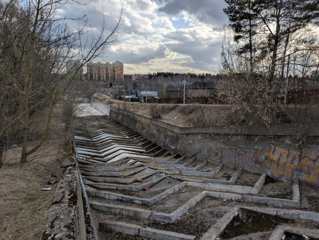 В сам музей я бы сходил в плохую погоду, а сегодня всё-таки больше тянет на улицу. Так что под конец нашей прогулки вместо изучения дачной жизни Маяковского предлагаю посмотреть на ещё одну уникальную достопримечательность, но уже искусственного происхождения — водосброс Учинского водохранилища. Если уровень воды в нём по каким-то причинам будет превышен, она должна пойти по этому каналу напрямую в Учу, минуя дамбу. Канал, естественно, направлен по течению реки.