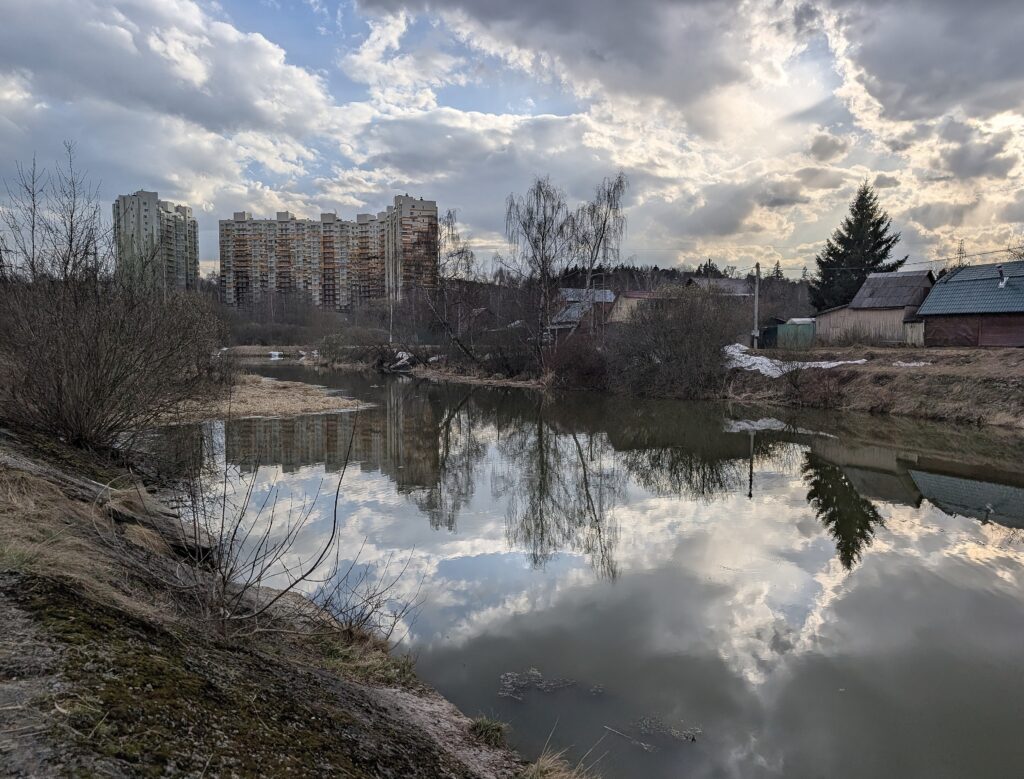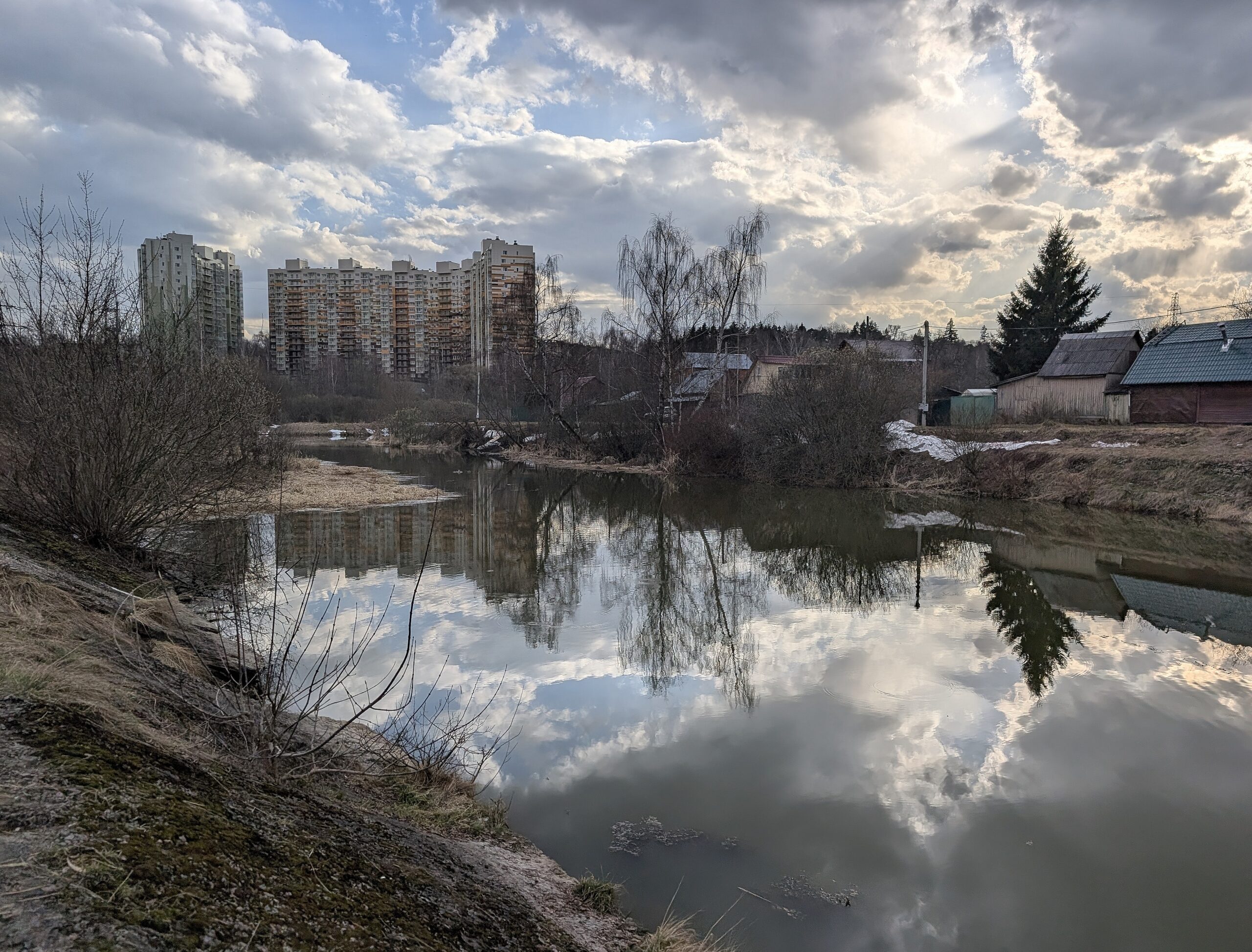 Вдалеке, на другом берегу, видны дома очередного свежепостроенного ЖК, расположенного в районе Мамонтовка. А совсем чуть дальше и правее за деревьями скрывается посёлок Акулово, относящийся, внезапно, к Москве — через него я проезжал на велосипеде пару лет назад в составе группы. Посёлок возводился специально для обслуживания гидроузла, являющегося частью системы водоснабжения столицы, поэтому и был присоединён именно к ней.