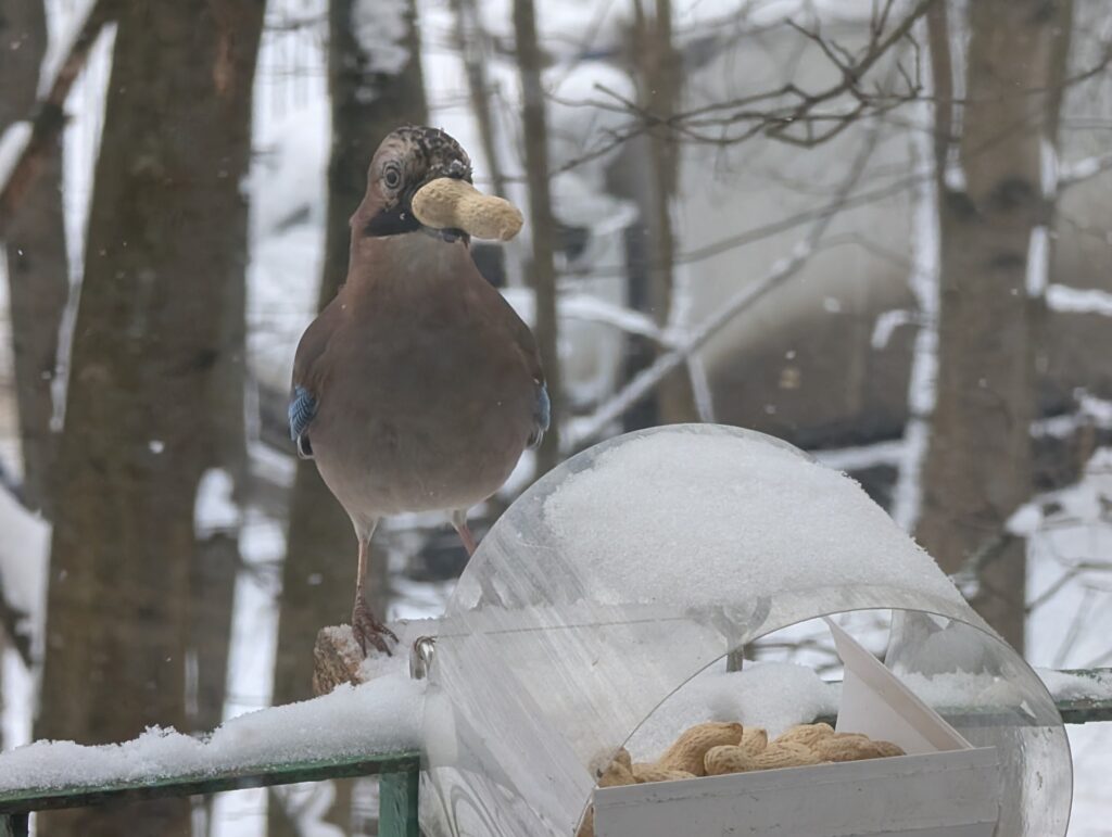 Вот уже почти год как я подкармливаю соек на заднем балконе, поскольку на балконе переднем, где висит моя основная кормушка, им сильно мешает защита от голубей. На протяжении короткого времени эта вторая кормушка также выполняла функцию ловушки, но я пришёл к выводу, что лишний раз этих птиц лучше не тревожить и самому тоже не напрягаться, а просто спокойно наблюдать за тем, как сойки летают туда-сюда. Иногда с ними даже получаются весёлые кадры =)