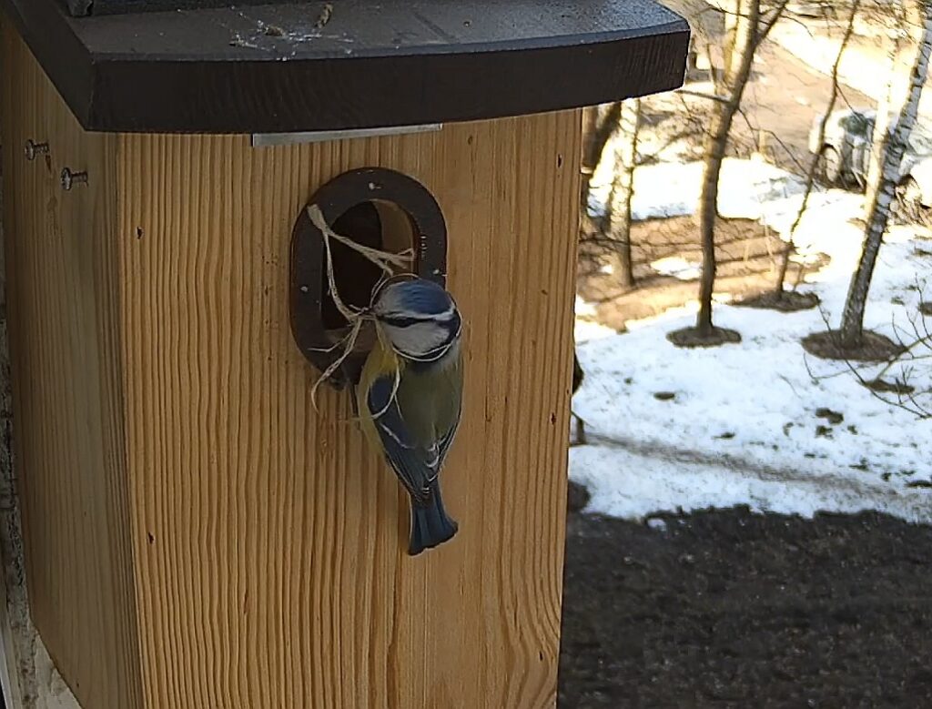Гнездовой сезон — крайне напряжённый период, особенно в условиях города: подходящих мест мало, и за каждое идёт ожесточённая борьба. Неудивительно, что многие занимают «жильё» ещё зимой, используя его для ночёвки, причём очень часто это птички из той же самой пары, которая ранее уже гнездилась в том же месте. Конкретно в моём случае это был самец лазоревки, принимавший участие в прошлогоднем выведении птенцов — ранее он уже отыскал самку, готовую убирать за ним мусор, а теперь она наконец приступает к строительству гнезда.
